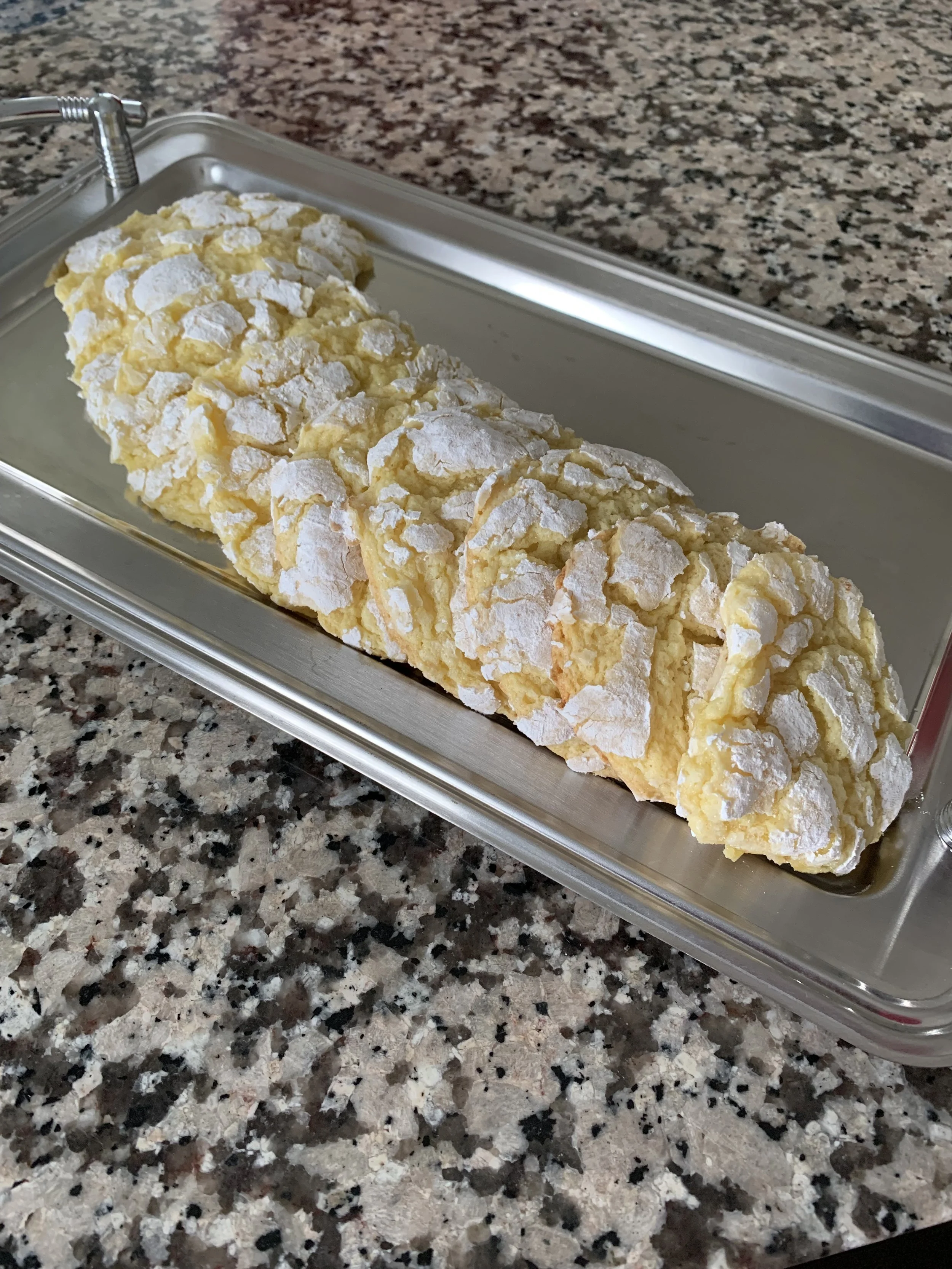 Crackle Lemon cookies, dusted with powdered sugar, on a silver tray.