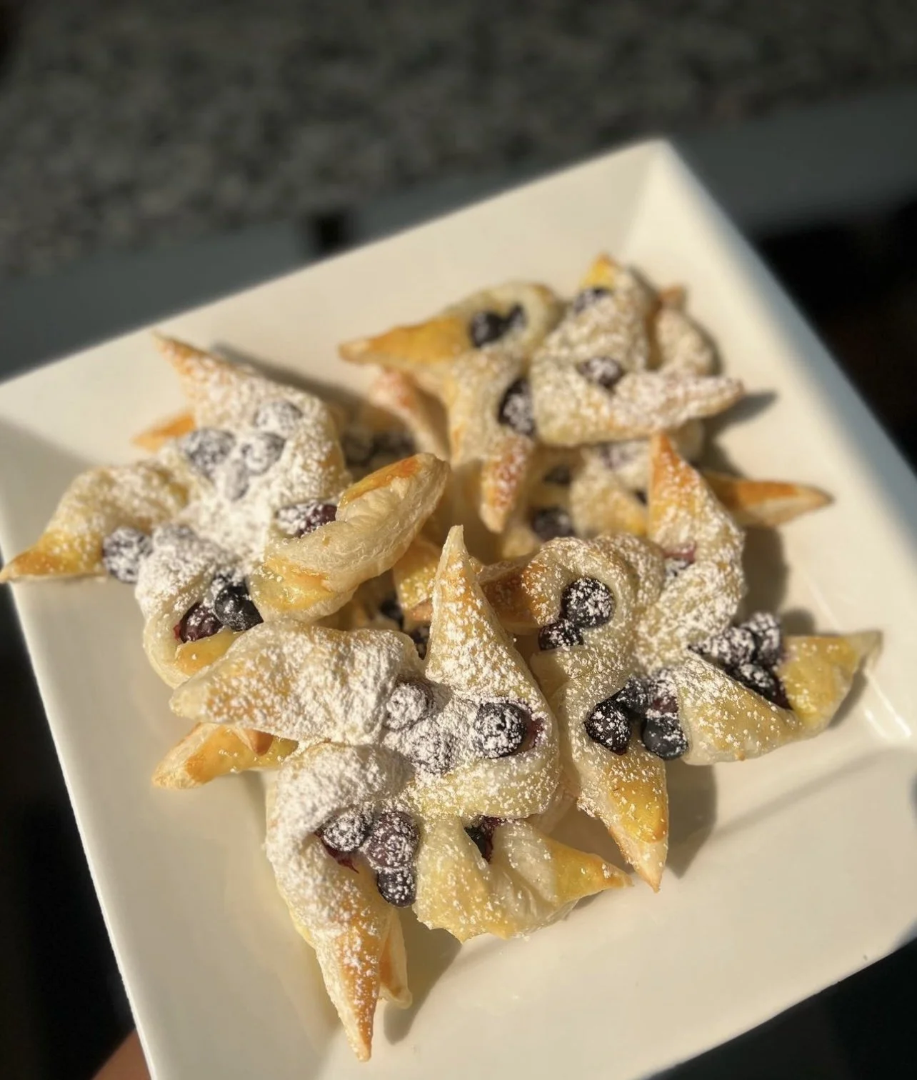 Star-shaped blueberry cream cheese pastries with powdered sugar on a white plate.